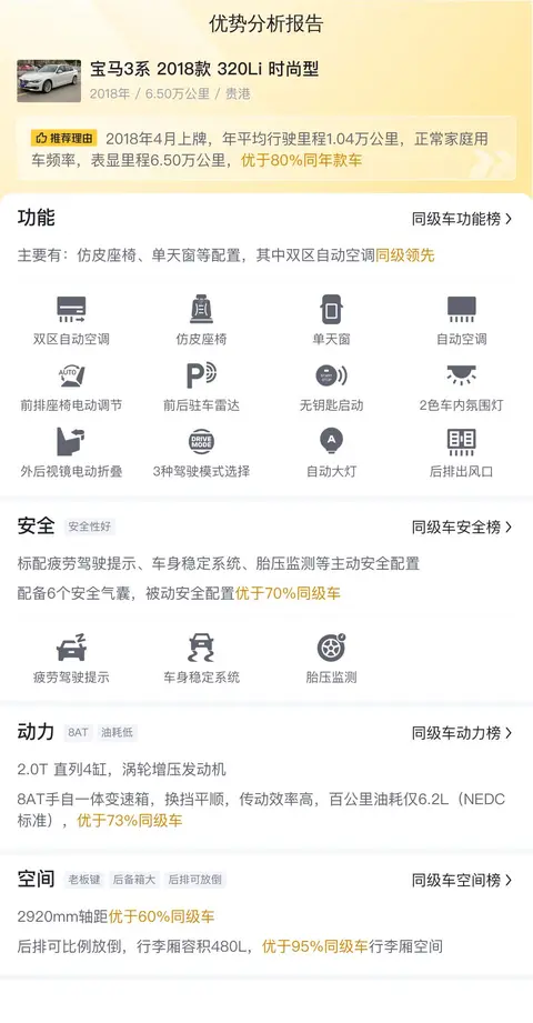 总的来说,这款宝马3系 2018款 320Li 时尚型是一款性能出色,配置丰富的豪华中型车,适合追求品质生活的消费者选择。当然,购买二手车需要谨慎,建议找专业人士进行检查,确保车况良好。