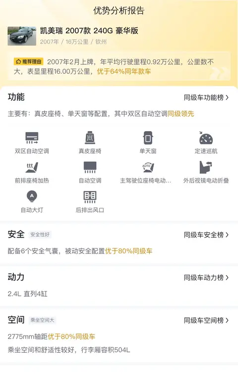 这辆凯美瑞的具体版本为——2007款 240G 豪华版,定位中型车,车身颜色为黑色,上牌地为钦州,上牌日期2007年2月,表显里程16万公里,新车指导价22.98万元,二手车报价2.35万元,相比新车指导价便宜了20.63万元,过户次数高达13次。