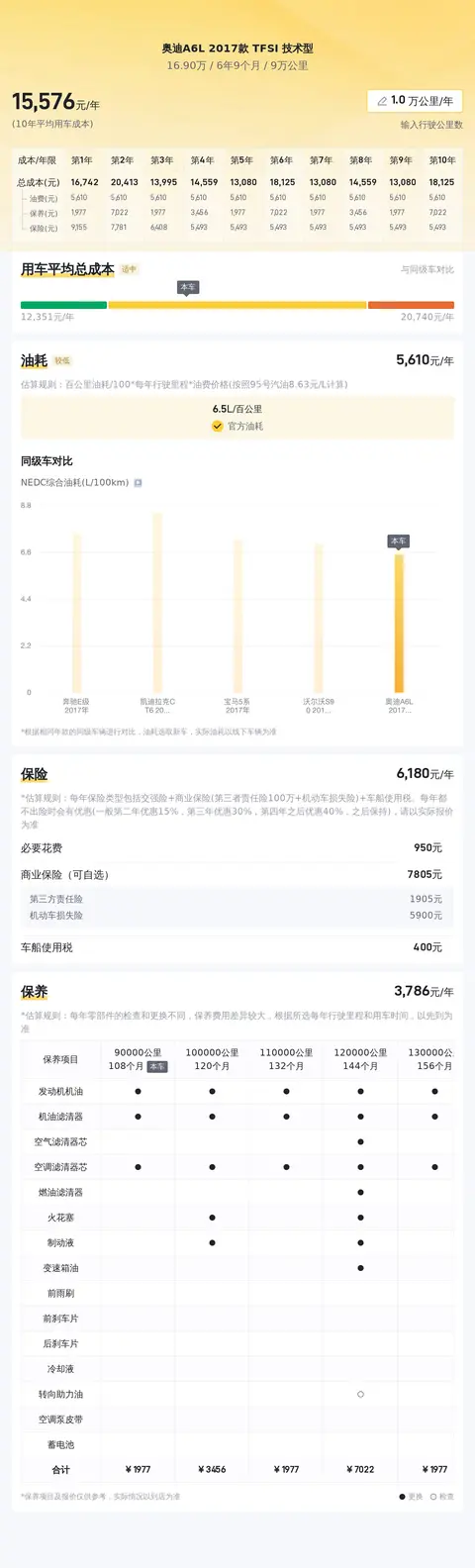 关于这辆车的用车成本,根据估算,这辆车年均综合用车成本大概在每年1.6万元左右。当然,每年的用车成本跟车主的驾驶习惯和行车环境有着直接关系。