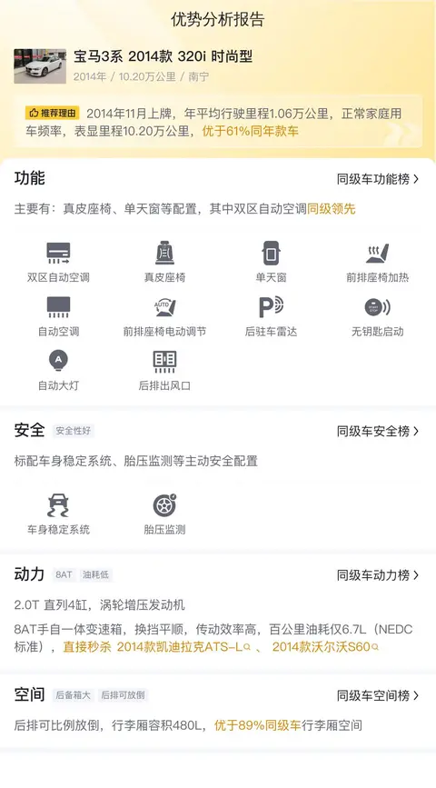 这辆宝马3系的具体版本为——宝马3系 2014款 320i 时尚型,采用白色车漆,属于中型车,2014年11月首次上牌,表显里程10.20万公里,车源地及上牌地均为南宁,0过户。新车指导价为34.30万元,而当前二手车报价为6.58万元。