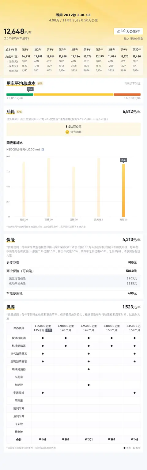 根据估算,这辆车年均综合用车成本大概在每年1.3万元左右。