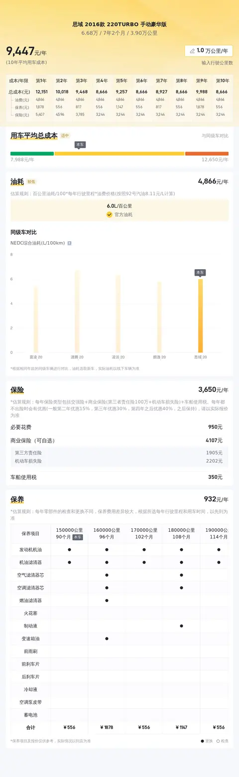 在用车成本方面,根据估算,这辆车的年均综合用车成本大概在每年0.9万元左右。这一数据仅供参考,具体费用可能会根据车辆的实际使用情况而有所不同。