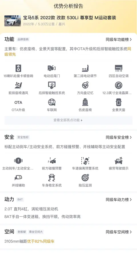 该车具体版本为—宝马5系2022款改款530Li尊享型M运动套装。该车定位中大型车,上牌地为浙江嘉兴,上牌时间2022年1月,表显里程5.33万公里,新车含税价为54.39万元,而现在的二手车报价为30.6万元,相当于开2年多便宜了23.79万元,约6折的价格。