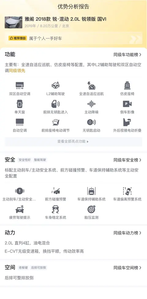 对于配置方面,这辆车配有仿皮座椅、单天窗、7英寸非全液晶屏以及倒车影像等实用配置。其中,倒车影像功能对于新手司机来说非常友好,可以有效减少停车时的盲区,提高安全性。安全配置上,标配主动刹车/主动安全系统、前方碰撞预警、车道偏离预警系统等主动安全配置,配备6个安全气囊,使其被动安全配置优于93%同级车。动力上搭载的是2.0L直列4缸油电混动发动机,与之匹配的是E-CVT无级变速箱,换挡平顺,传动效率高。百公里油耗仅4.2L,低于同级车油耗平均值,燃油经济性好。同时,纯电续航里程为22km,满足日常通勤需求。百公里加速成绩8.9s,优于大部分同级车。