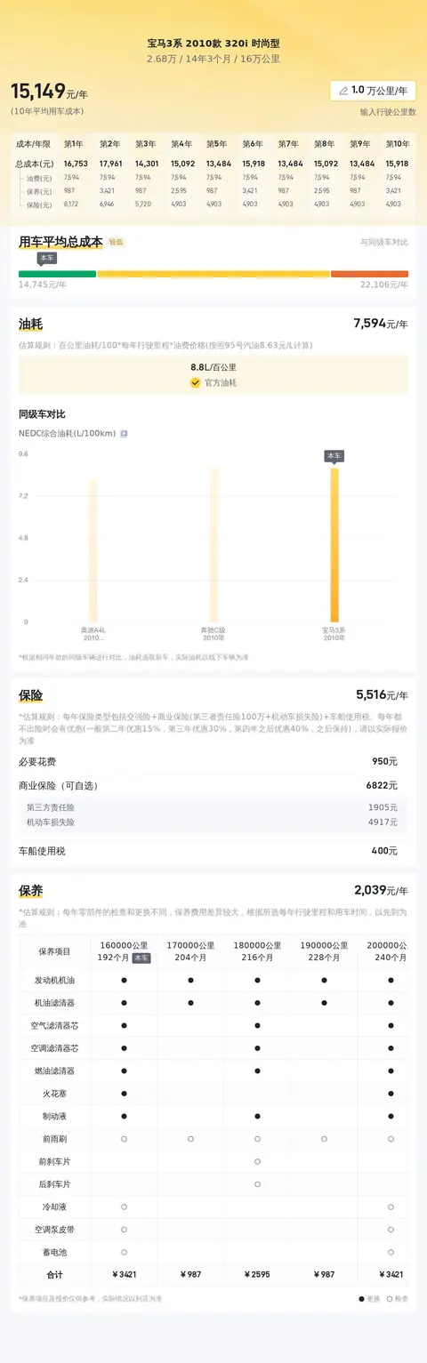 从目前的二手车市场行情来看,宝马3系 2010款 320i 时尚型的二手车行情大致在2.97万至3.78万之间,当然具体的售价会根据车辆状况而有所波动。根据估算,这辆车年均综合用车成本大概在每年1.5万元左右。