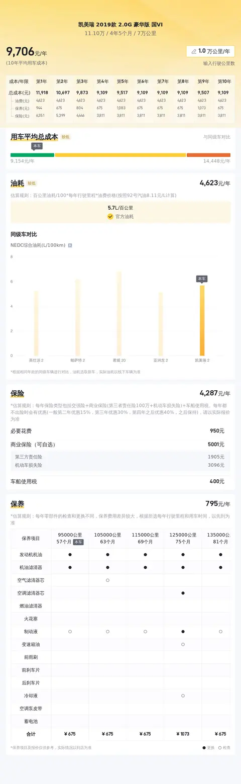 在选择二手车的时候,我们除了要考虑车辆的车况,还要考虑用车成本,下面我们将为您提供该车在全国中型车的多项年度平均用车成本。