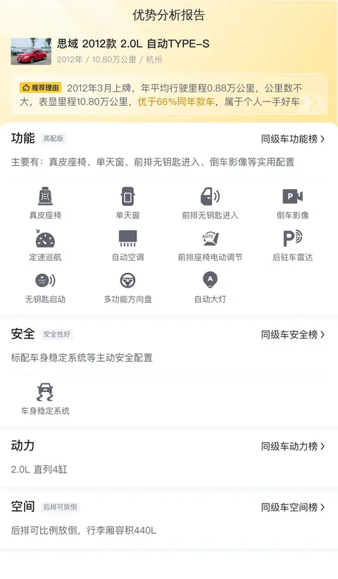 与同级车相比,这辆车在安全、动力、舒适度方面都有不错的表现。安全配置优于60%同级车,动力优于79%同级车,舒适度优于68%同级车,具体配置可见下图。