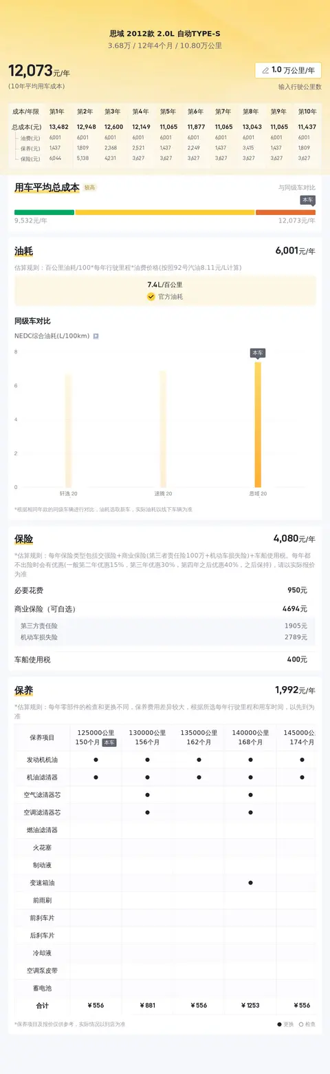 根据估算,这辆车年均综合用车成本大概在每年1.2万元左右。具体费用花销要看用车频率、环境等因素而定。