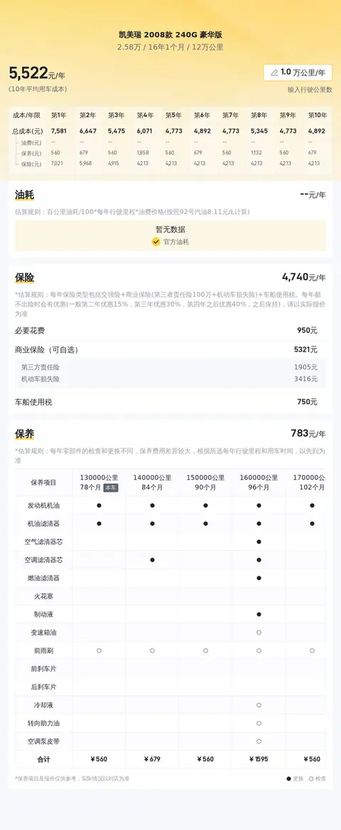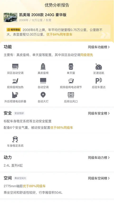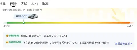 凯美瑞2008款240G豪华版的市场行情价格在2.47万-3.25万之间,它的报价则是2.58万,价格处于适中水平,但保值率较低,仅27.77%,远低于同级车的55.26%的平均值。