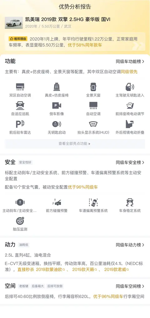此车具体版本为凯美瑞 2019款 双擎 2.5HG 豪华版 国VI,定位于中型车市场。上牌日期为2020年1月,表显里程5.50万公里。这车新车指导价23.98万,目前二手车报价12.79万,相比新车指导价便宜了11.19万。