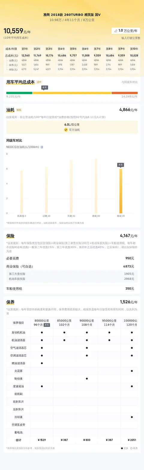 雅阁 2018款 260TURBO 精英版 国V 10年平均用车成本是11237元/年,6年的是11192元/年,3年的是10899元/年,和同级车相比,养车成本较低。