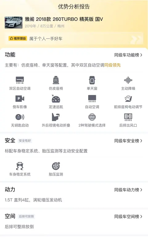 雅阁 2018款 260TURBO 精英版 国V在对比同级车的竞争力指数是73%,优势明显,其中内饰、安全和空间优于70%同级车,而在动力和舒适性方面则略低于同级车。