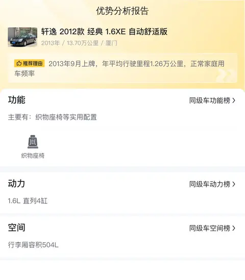 具体版本为——轩逸2012款经典1.6XE自动舒适版,定位是紧凑型车,车身颜色为黑色,上牌地为厦门,上牌日期2013年9月,表显里程13.70万公里,新车指导价10.98万,二手车报价1.98万,过户次数1次。