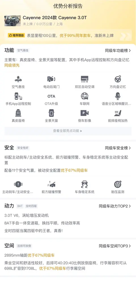这辆车的具体版本是——Cayenne 2024款 Cayenne 3.0T,定位中大型SUV,2024年上牌,未上牌,牌照及车源所在地均在上海,表显里程0.01万公里,目前0过户,新车含税价为103.65万,目前二手车报价100万。