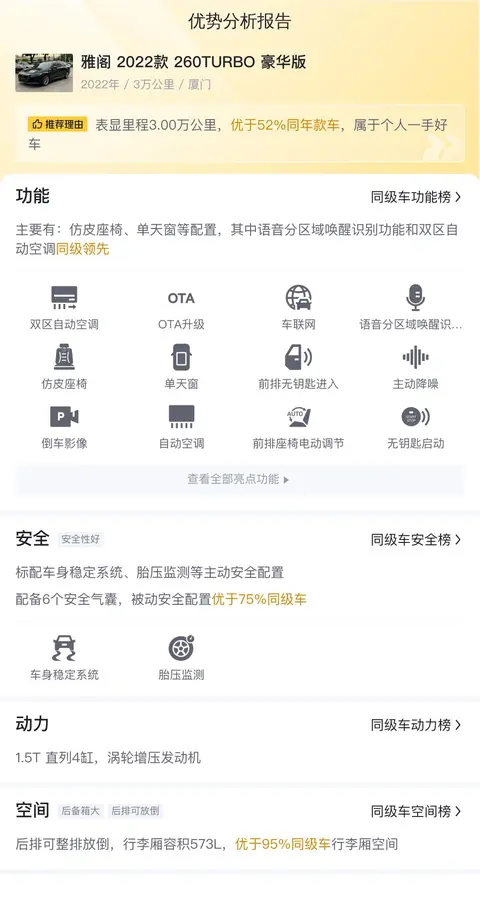 总结:这辆雅阁2022款 260TURBO 豪华版在动力、空间和舒适度方面都表现出色,且保值率较高。如果您正在寻找一款性能稳定、空间宽敞、配置丰富的中型车,那么这辆雅阁绝对值得您考虑。当然,购买二手车时,还需要根据车辆的实际情况进行综合考量。