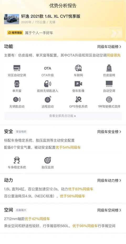 总的来说,这辆轩逸是一款性价比高的二手车,无论是从配置、安全还是动力方面都表现出色。如果您正在寻找一款实用、经济的家用轿车,那么这辆轩逸绝对值得您考虑。当然,在购买二手车时,还需要综合考虑车辆的车况、价格等因素,做出明智的选择。