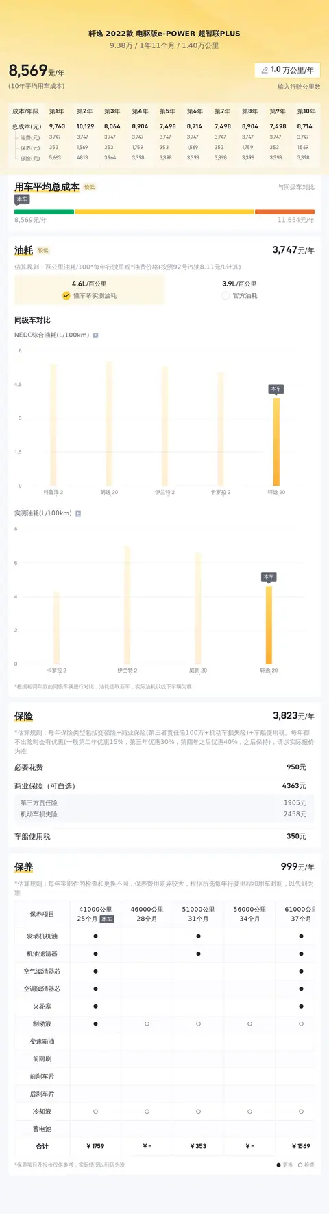 在用车成本方面,根据估算,这辆车年均综合用车成本大概在每年0.9万元左右。不过,这是按每年行驶1万公里计,同时受不同地区政策和用车环境的影响,实际费用可能有所差异。