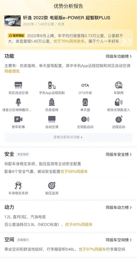 如图片所示,该车具体版本为—轩逸2022款电驱版e-POWER超智联PLUS,定位紧凑型车,车身颜色为白色,已在车管所上牌2年,牌照及排放标准均为当地主流,表显里程为1.40万公里,0过户。该车首次上牌时间为2022年8月,地点在东莞。新车含税价为16.00万元,而当前二手车报价为9.38万元。