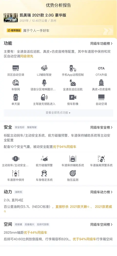 本篇所述的凯美瑞具体版本为2021款 2.0G 豪华版,该车定位中型车,外观颜色为白色,内饰深色。2021年10月首次上牌,车源地及车牌所在地均为苏州,目前0过户。目前表显里程12.40万公里,新车含税价为22.02万,现在的二手车报价10.98万。