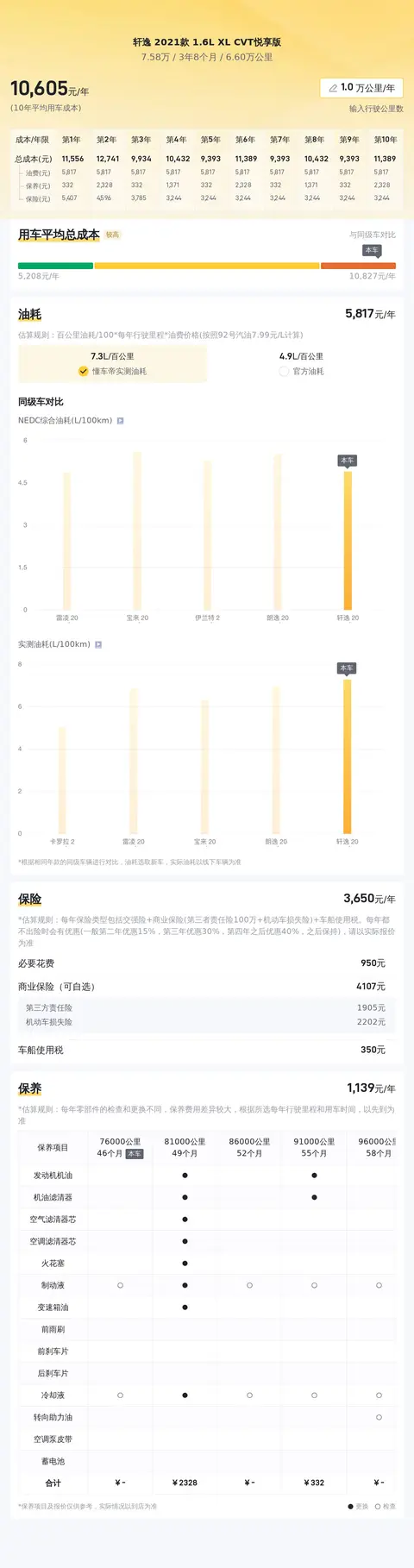 用车成本是每位车主都关心的问题。根据估算,这款轩逸2021款1.6L XL CVT悦享版的年均综合用车成本大概在每年1.1万元左右。这一数据基于每年行驶1万公里、燃油标号为92号汽油、商业保险基本险为第三者责任险100万+机动车损失险以及交强险的组合方案计算得出。