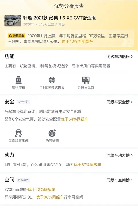 轩逸 2021款 经典 1.6 XE CVT舒适版在动力、操控、安全等方面表现出色,优于大部分同级车。同时,其较低的油耗和维护成本也使其成为家庭用户的理想选择。