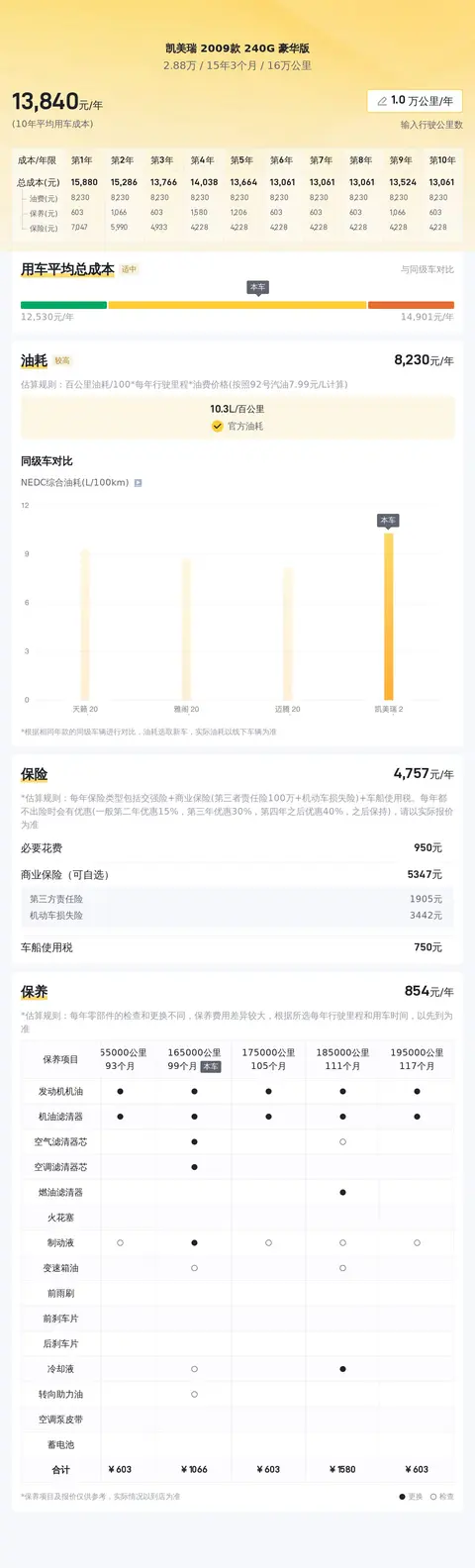 当前市场上,这款凯美瑞 2009款 240G 豪华版的二手车价格大约在2.59万至3.60万之间。用车成本方面,根据估算,这辆车的年均综合用车成本约为1.4万元左右。
