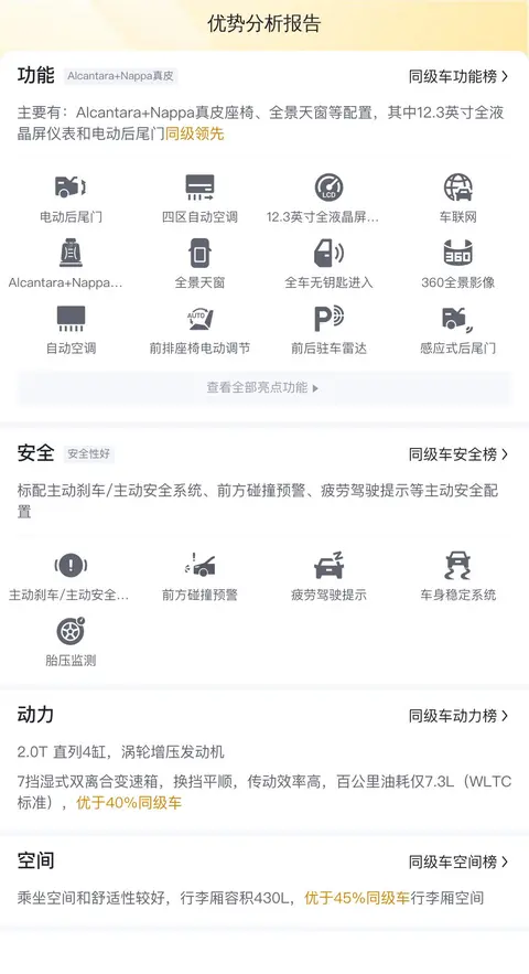 通过大数据分析,本车在配置价值、保值率和动力性能等方面优于80%的同级车。在配置价值方面,本车配备了丰富的智能互联功能和舒适性配置,为用户带来便捷的智能驾驶体验和舒适的乘坐环境。在保值率方面,本车的保值率较高,未来几年内的折旧率较低,具有较高的投资价值。在动力性能方面,本车搭载的2.0T涡轮增压发动机和7挡湿式双离合变速箱提供了强劲的动力输出和稳定的换挡表现,为用户带来出色的驾驶体验。