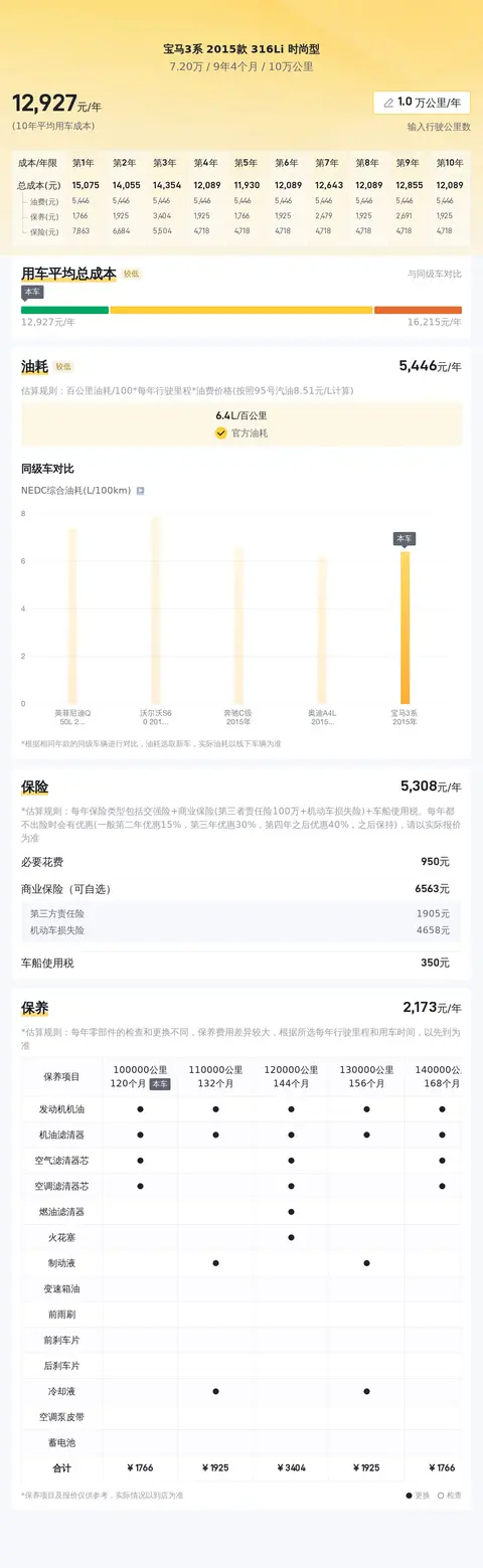 目前这款车的二手车行情大致在7.79万至10.15万之间,而本车的报价仅为7.2万,价格相对实惠。根据估算,这辆车年均综合用车成本大概在每年1.3万元左右。