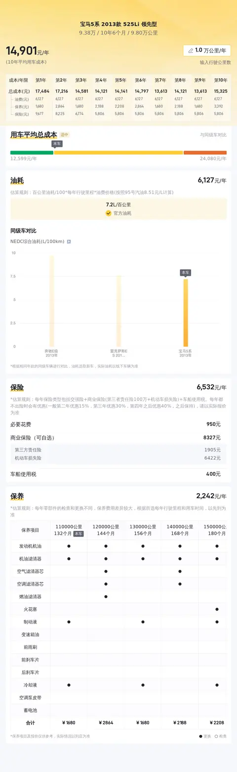这辆宝马5系2013款 525Li 领先型,2014年1月首次上牌,牌照及车源所在地均在中山,目前0过户。新车含税价为51.96万,现在的二手车报价为9.38万,相当于开十年多便宜了42.58万。