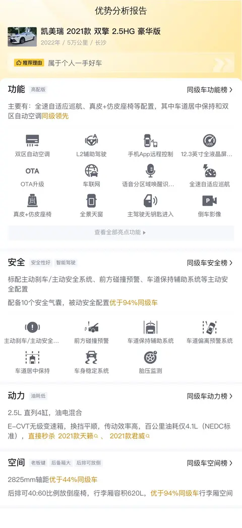 综合来看,这辆凯美瑞 2022款 双擎 2.5HG 豪华版是一款值得考虑的二手车选择。它不仅有着不错的性能和配置,而且价格也比较合理。如果您正在寻找一款性价比高的二手车,那么这辆车绝对值得您关注。