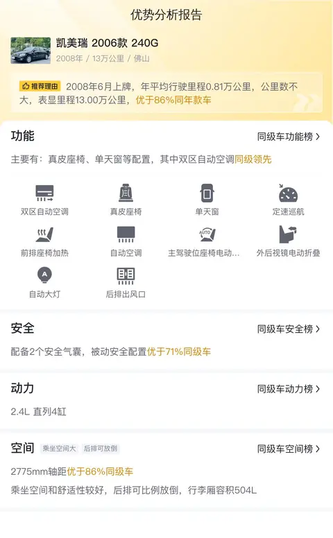 先来看看这辆二手凯美瑞的基本情况,该车具体版本为——凯美瑞 2006款 240G。它的表显里程为13万公里,于2008年6月上牌,目前牌照所在地为佛山,有1次过户记录。新车指导价为22.98万元,而现在的二手车报价仅为3.68万元。