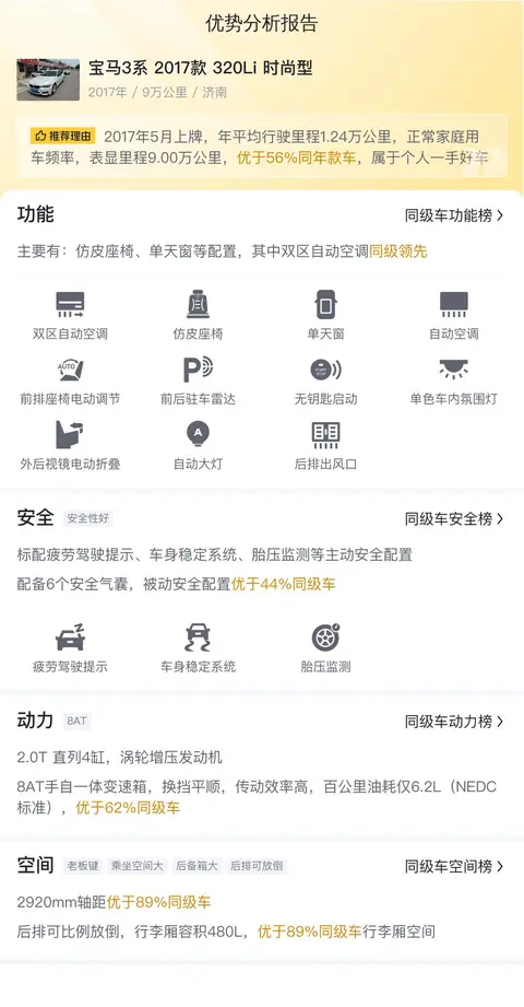 综合以上,这辆二手宝马3系 2017款 320Li 时尚型在安全配置、动力性能、舒适性配置以及功能配置等方面表现出色,且价格相对实惠。如果您正在寻找一款性价比高的二手豪华中型车,不妨考虑一下这辆车。当然,二手车一车一况,一况一价,车辆的具体售价还要看车辆的具体情况而定。