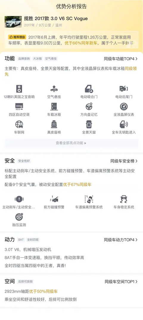 总结:这辆二手揽胜2017款 3.0 V6 SC Vogue,从车况到配置再到价格,都是比较不错的,如果您喜欢这款车型,那么这辆二手揽胜2017款 3.0 V6 SC Vogue绝对值得您考虑。