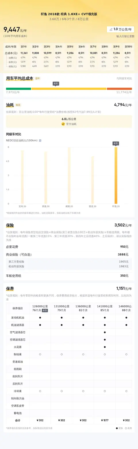 在用车成本方面,根据估算,这辆车年均综合用车成本大概在每年0.9万元左右。实际费用开销会根据用车强度和环境等因素有所改变。