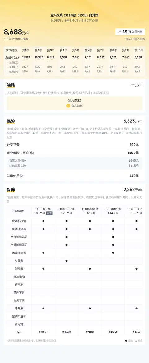 当然,购买二手车也需要考虑用车成本。除了燃油费外,保险费和保养费也是重要的开支。不过,这辆宝马5系 2014款 520Li 典雅型的保险类型齐全,包括交强险、商业保险等,能够为车主提供全面的保障。此外,宝马品牌的售后服务也比较完善,车主可以享受到专业的维修保养服务。