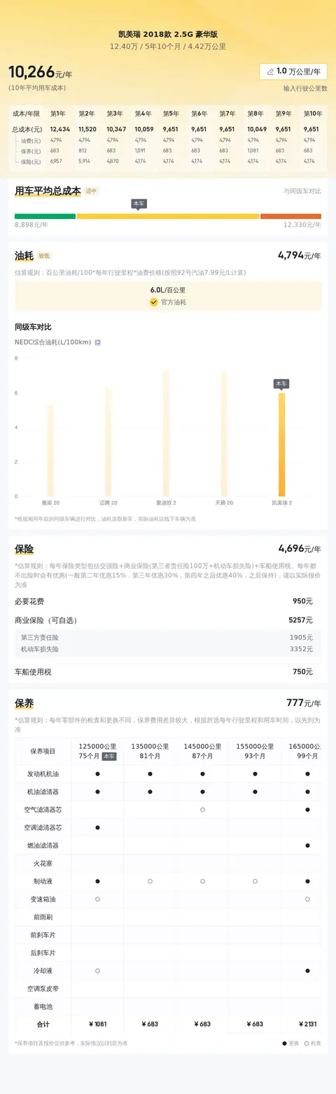 根据估算,这辆车年均综合用车成本大概在每年1.0万元左右。当然,具体的费用支出会根据车主的用车习惯和使用强度有所差异。