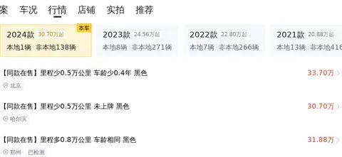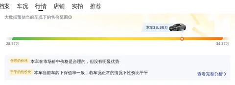 目前这款车的二手车行情大致在28.77万至34.37万之间。这里要说的是,车辆的具体售价会受车辆保养情况、使用年限和行驶里程等因素的影响,大家在购车时还是要根据车辆的实际情况来判断。