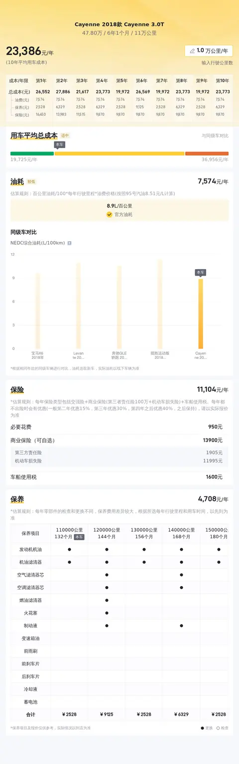 用车成本方面,按一年行驶一万公里计算,该车的年度平均用车成本约为23290元,具体费用包括油费、保险费和保养费。这一数据仅供参考,实际费用可能因个人驾驶习惯和用车环境等因素而有所差异。
