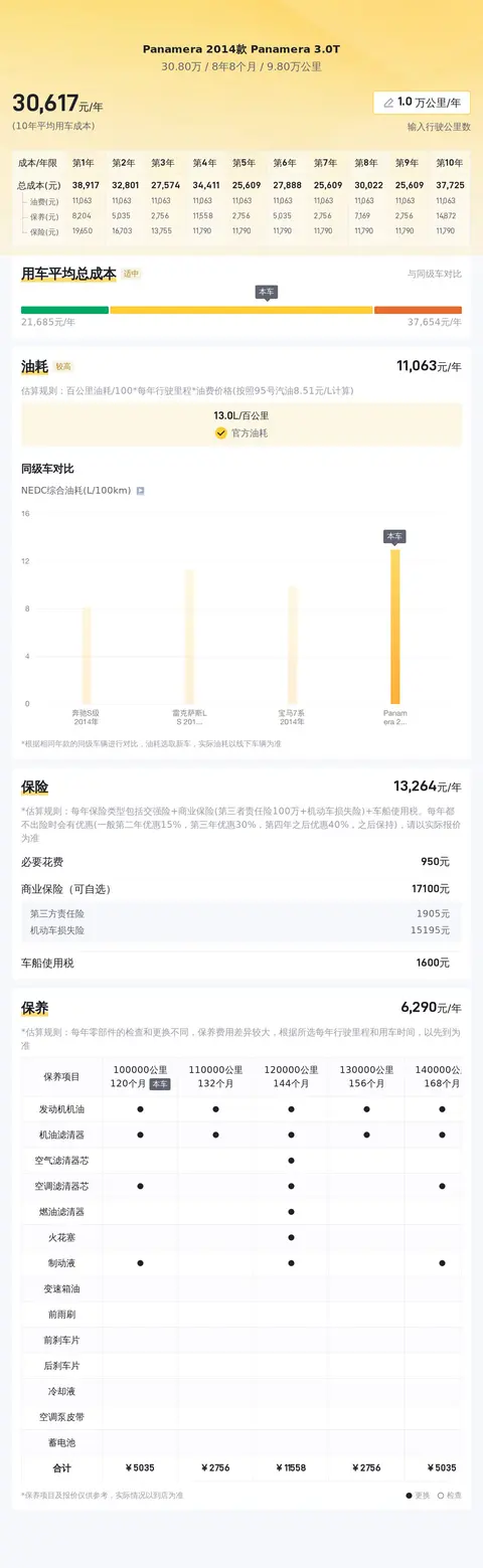 此车具体版本为——Panamera 2014款 Panamera 3.0T,定位是大型轿车,上牌地为浙江温州,上牌日期2015年12月,表显里程9.80万公里,新车含税价为124.50万元,而现在的二手车报价仅为30.80万元,相较于新车价格,便宜了93.70万元。