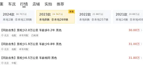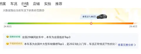 目前这款车的二手车行情大致在24.83万至29.40万之间。当然,市场行情价和最终成交价是有差异的,因为车辆的车况等不同,会影响最终成交价。