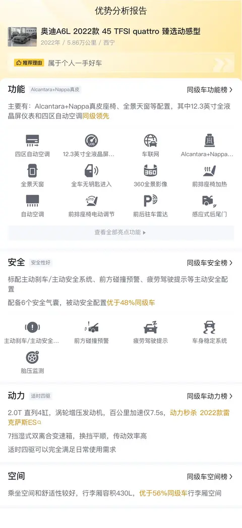 通过综合对比,我们发现这辆奥迪A6L在安全、动力、空间等方面都优于80%的同级车。同时,它的保值率也较高,未来几年内贬值幅度相对较小。如果您正在寻找一款豪华中大型轿车,那么这辆奥迪A6L绝对值得考虑。