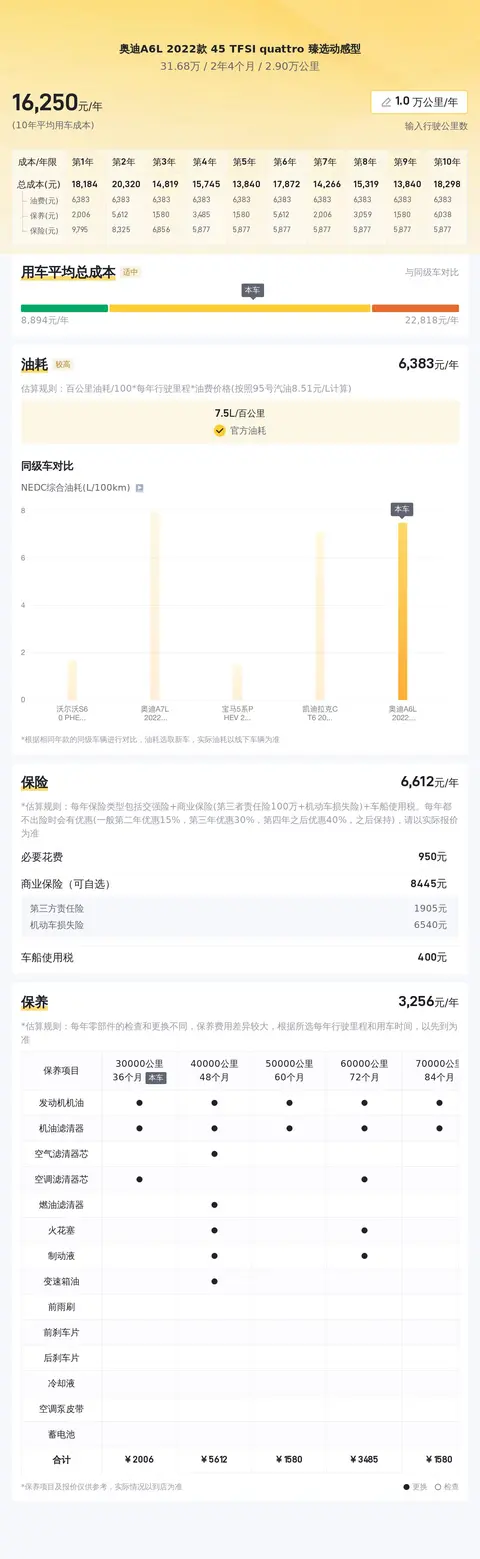 市场行情显示,这款车型的二手车价格区间大致在29万至35万元左右。用车成本方面,根据估算,这辆车的年均综合用车成本约为1.6万元。这些数据仅供参考,实际费用可能因个人使用习惯而异。