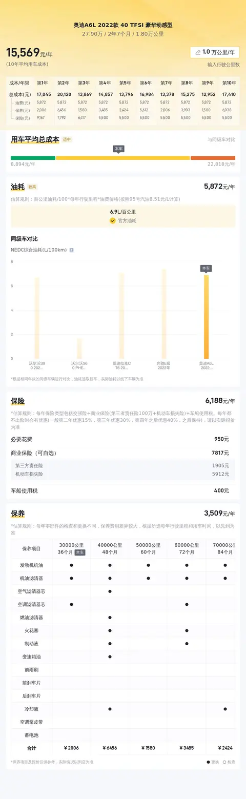 市场行情方面,同款奥迪A6L的二手车行情大致在26.21万至31.26万之间。具体的价格会受到车辆状况等因素的影响。根据估算,这辆车的年均综合用车成本在每年1.6万元左右,而同级车的最低用车成本为每年1.4万元。