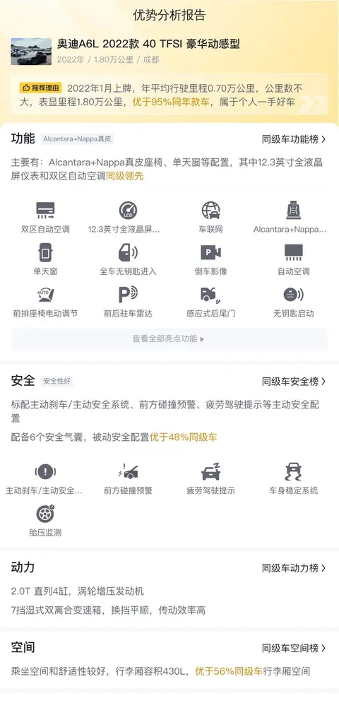 这辆奥迪A6L的具体版本是——2022款 40 TFSI 豪华动感型,定位中大型车,车身颜色为黑色。2022年1月首次上牌,牌照及车源所在地均在成都,0过户。目前表显里程1.80万公里,相对新车指导价41.98万,现二手车报价27.90万,相当于开两年多便宜了14.08万。