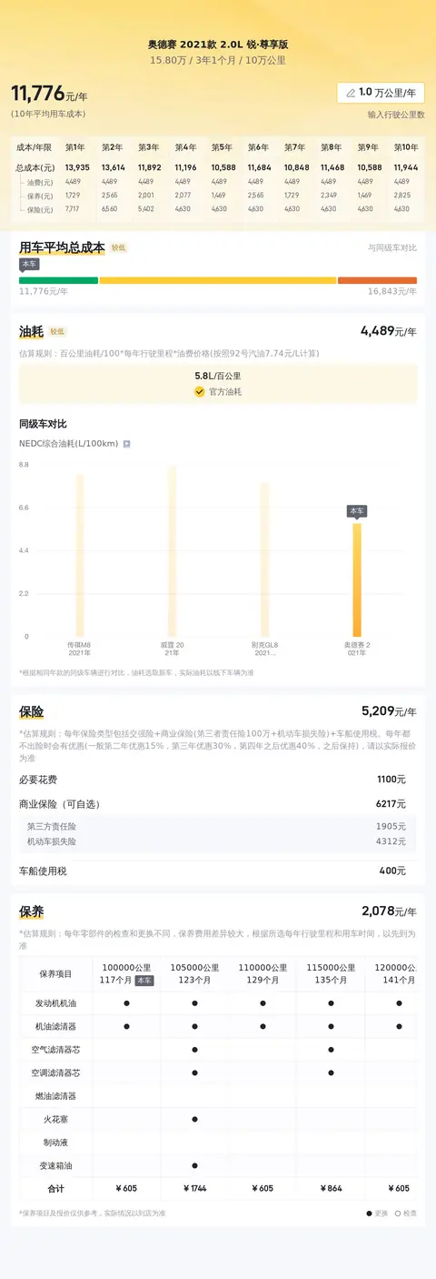 关于这款车的用车成本,根据估算,这辆车年均综合用车成本大概在每年1.2万元左右。不过具体的用车成本还是要根据车辆的实际使用情况而定。