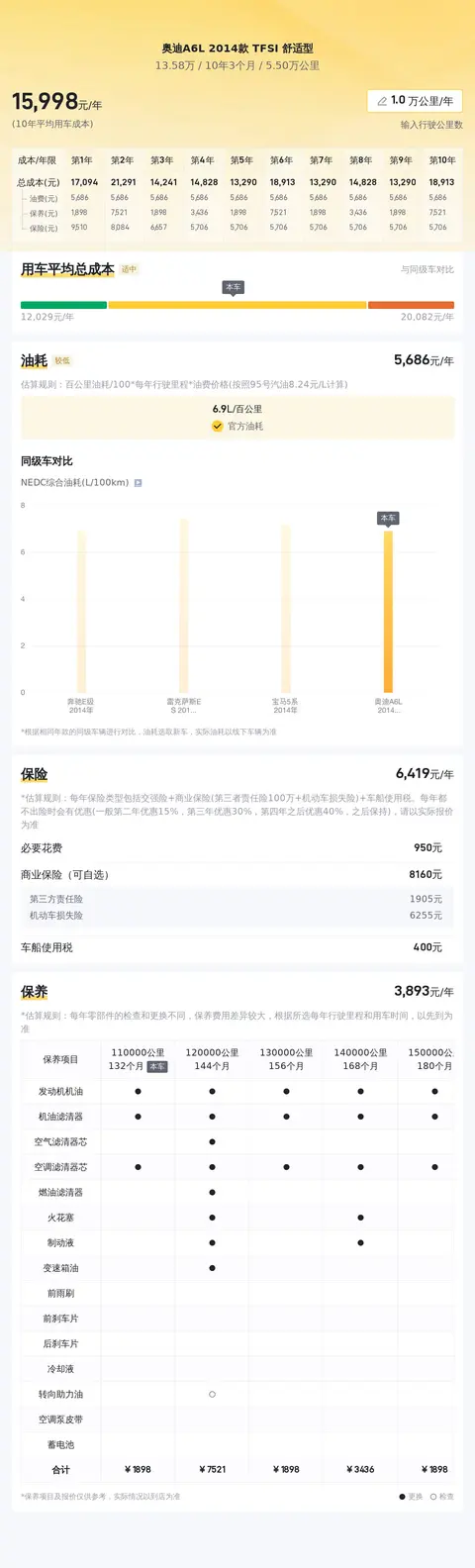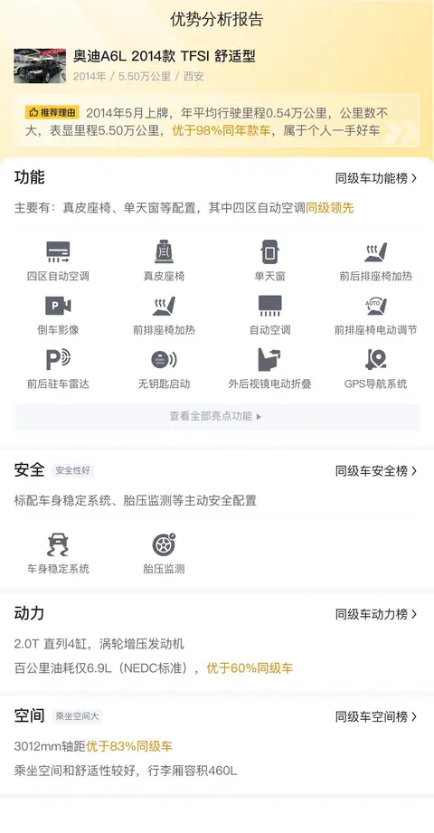 这款二手奥迪A6L的具体版本为——2014款 TFSI 舒适型,上牌日期2014年5月,表显里程5.50万公里,新车指导价44.66万元,二手车报价13.58万元,0过户,符合国VI排放标准,目前车源所在地和上牌地均为西安。