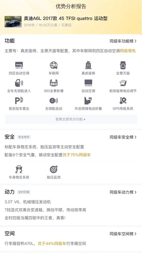 这辆二手奥迪A6L的具体版本为——2017款 45 TFSI quattro 运动型。该车定位于中大型轿车,2016年10月首次上牌,上牌地为石家庄,表显里程16.50万公里,有1次过户记录。新车指导价为53.05万元,目前二手车报价14.98万元。