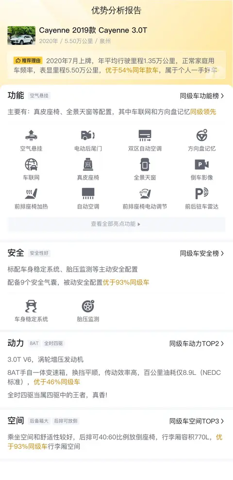 接下来,让我们一起看看这辆二手保时捷Cayenne(图片|配置|询价) 2019款 Cayenne 3.0T的基本车况信息。该车具体版本为—Cayenne 2019款 Cayenne 3.0T,定位是中大型SUV,车身颜色为白色,前任车主保养到位,车身外观干净整洁。截至2024年8月,表显里程为5.50万公里,新车指导价为91.30万,二手车报价63.30万,2020年7月首次上牌,在此期间过户0次。车源地和上牌地都是泉州。