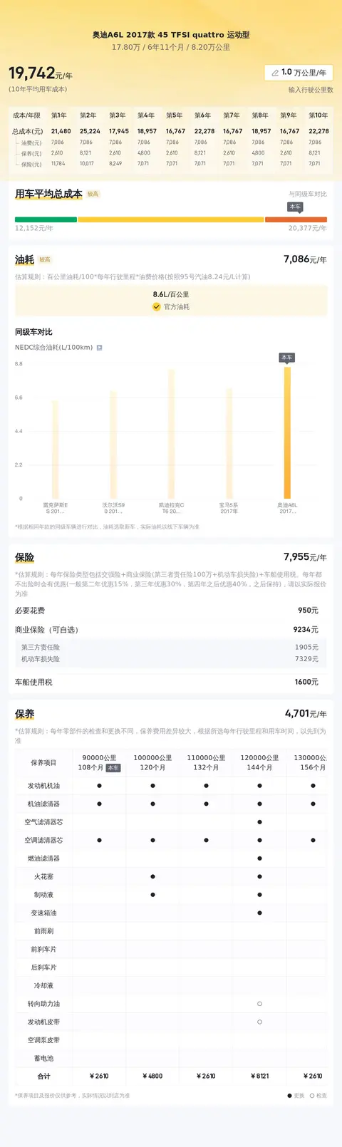 关于这款车的市场行情,目前的二手车行情大致在18万至22万之间。在用车成本这块,根据估算,这辆车年均综合用车成本大概在每年2.0万元左右。