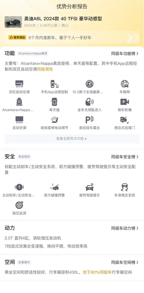 这辆车的具体版本是——奥迪A6L 2024款 40 TFSI 豪华动感型,2024年2月首次上牌,在此期间过户0次。车源地和上牌地均在佛山,表显里程为0.06万公里。该车新车指导价42.79万,二手车报价31.98万。